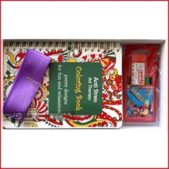 شامل یک دفتر رنگ آمیزی، یک دفترچه یادداشت رنگ آمیزی، یک دفتر یادداشت، یک جعبه کادویی و مداد رنگی شش رنگ و تراش و پاکن