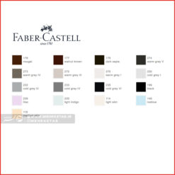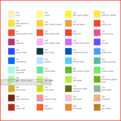 | رنگ / کد | 103 – ivory, 102 – cream, 104 – light yellow glaze, 107 – cadmium yellow, 108 – dark cadmium yellow, 109 – dark chrome yellow, 113 – orange glaze, 118 – scarlet red, 121 – pale geranium lake, 219 – deep scarlet red, 223 – deep red, 127 – pink carmine, 133 – magenta, 129 – pink madder lake, 125 – middle purple pink, 134 – crimson, 136 – purple violet, 157 – dark indigo, 247 – indanthrene blue, 143 – cobalt blue, 120 – ultramarine, 146 – skyblue, 110 – phthalo blue, 153 – cobalt turquoise, 154 – light cobalt turquoise, 156 – cobalt green, 264 – dark phthalo green, 161 – phthalo green, 162 – light phthalo green, 171 – light green, 112 – leaf green, 167 – permanent green olive, 268 – green gold, 170 – may green, 174 – chromium green opaque, 172 – earth green, 169 – caput mortuum, 131 – medium flesh, 132 – light flesh, 189 – cinnamon, 192 – Indian red, 188 – sanguine, 186 – terracotta, 180 – raw umber, 178 – nougat, 177 – walnut brown, 175 – dark sepia, 274 – warm grey V, 273 – warm grey IV, 272 – warm grey III, 270 – warm grey I, 230 – cold grey I, 232 – cold grey III, 233 – cold grey IV, 235 – cold grey VI, 199 – black, 239 – lilac, 220 – light indigo, 114 – light skin, 148 – iceblue, 116 – medium skin |
